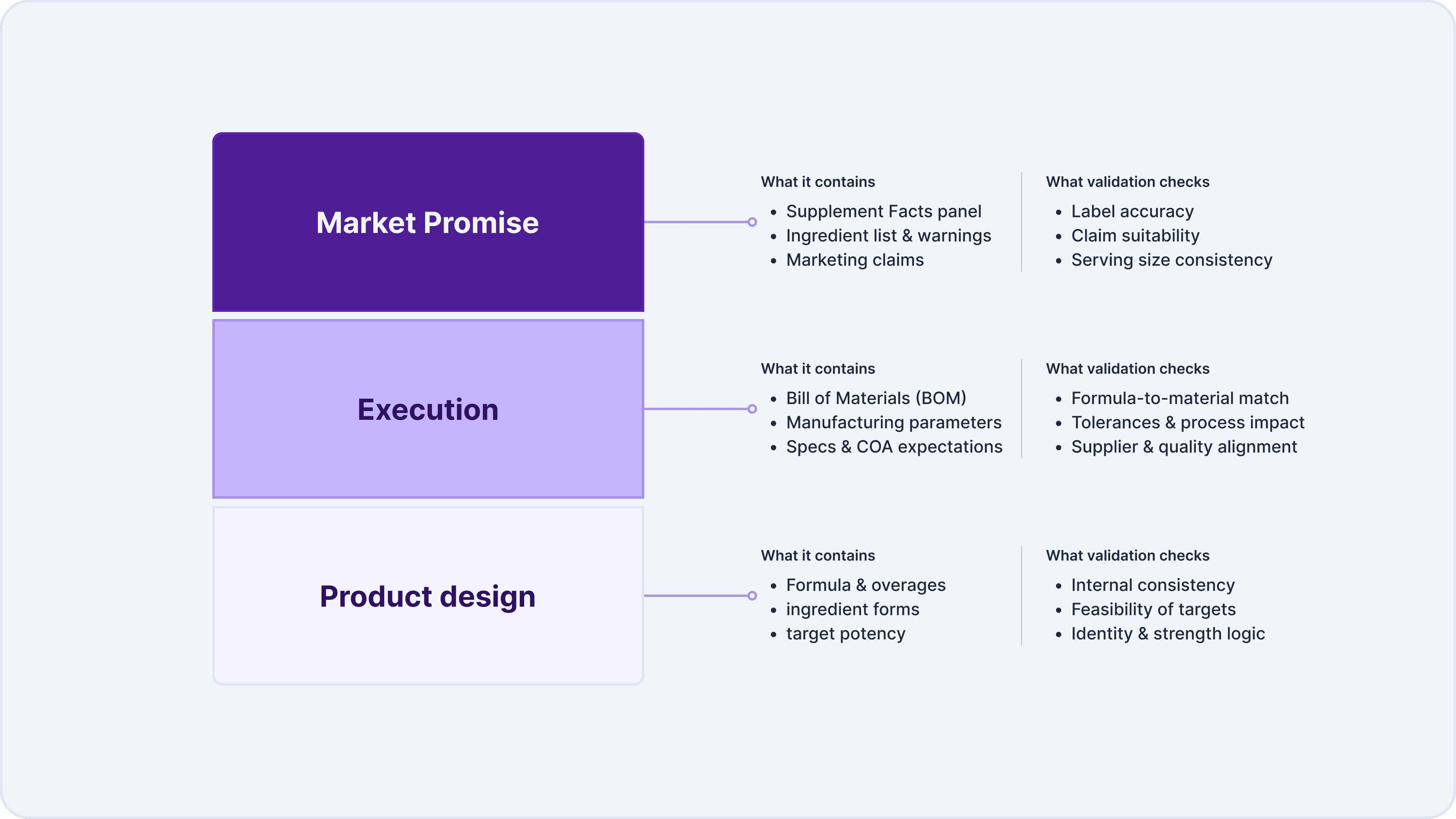 Start by defining the authoritative source for each element: ingredient identity, label amounts, allergen statements, claim language, and specs. Then define what constitutes a required validation event, including supplier changes and any label updates.